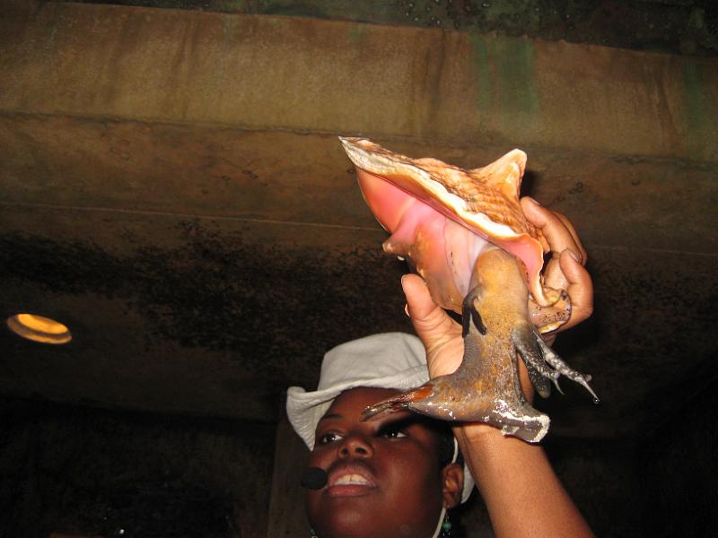 Terica displays a conch that hasn't yet left his shell behind, and explains how this is almost a staple of Bahamian cuisine.